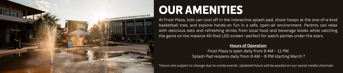 At Frost Plaza kids can play in the interactive splash pad, shoot hoops at the one-of-a-kind basketball tree, and explore hands-on fun in a safe, open-air environment. Parents can kick back with delicious eats and cold drinks from local food and beverage kiosks, while catching the game on the massive 40-foot LED screen—perfect for watch parties under the stars.