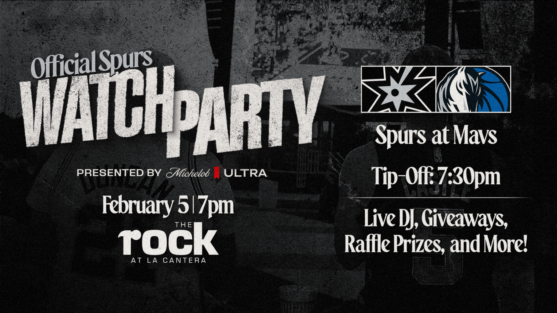 Join your fellow Spurs fans for the Official Spurs Watch Party, presented by Michelob ULTRA, in Frost Plaza at The Rock at La Cantera on Thursday, February 5. The party starts at 7:00PM and the Spurs tipoff against the Mavericks at 7:30PM! Get there early for a chance to receive raffle tickets, enjoy interactive games and more!