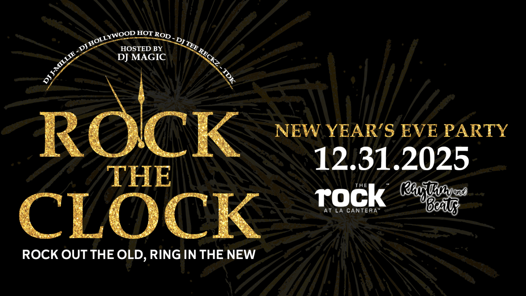 Join Rhythm & Beats DJs for Rock the Clock, the ultimate New Year’s Eve celebration — hosted by DJ Magic. Ring in 2026 in style with high-energy music, an unforgettable countdown, and a spectacular fireworks show as the clock strikes midnight.