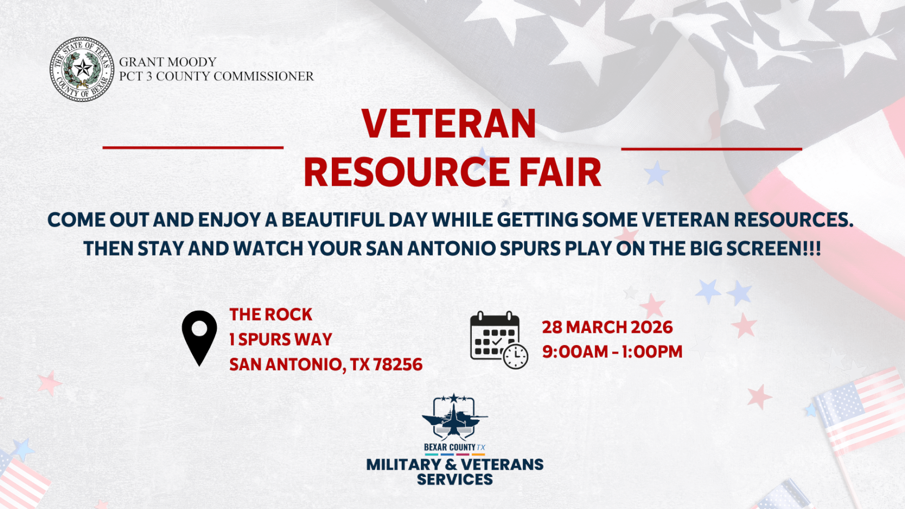Bexar County and Commissioner Grant Moody invite you to The Rock at La Cantera on March 28 for a dedicated Veteran Resource Fair. Running from 9AM to 1PM, this event offers a beautiful outdoor setting for local heroes to connect with essential Bexar County Military and Veterans Services. After exploring the available resources, we encourage everyone to stay and cheer on our San Antonio Spurs as they play on our big screen at 2PM!