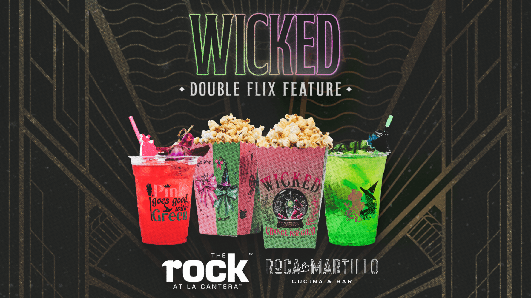 Sip and snack in style with our exclusive event specials. Choose between our “Glinda” or “Elphaba” inspired cocktails and mocktails. Each drink comes in a branded cup with a reusable souvenir straw.